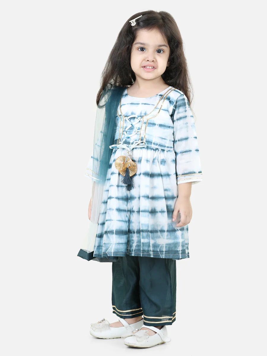 BownBee Hand Dyed Chanderi Silk Kurti Pant with Dupatta for Girls - Blue