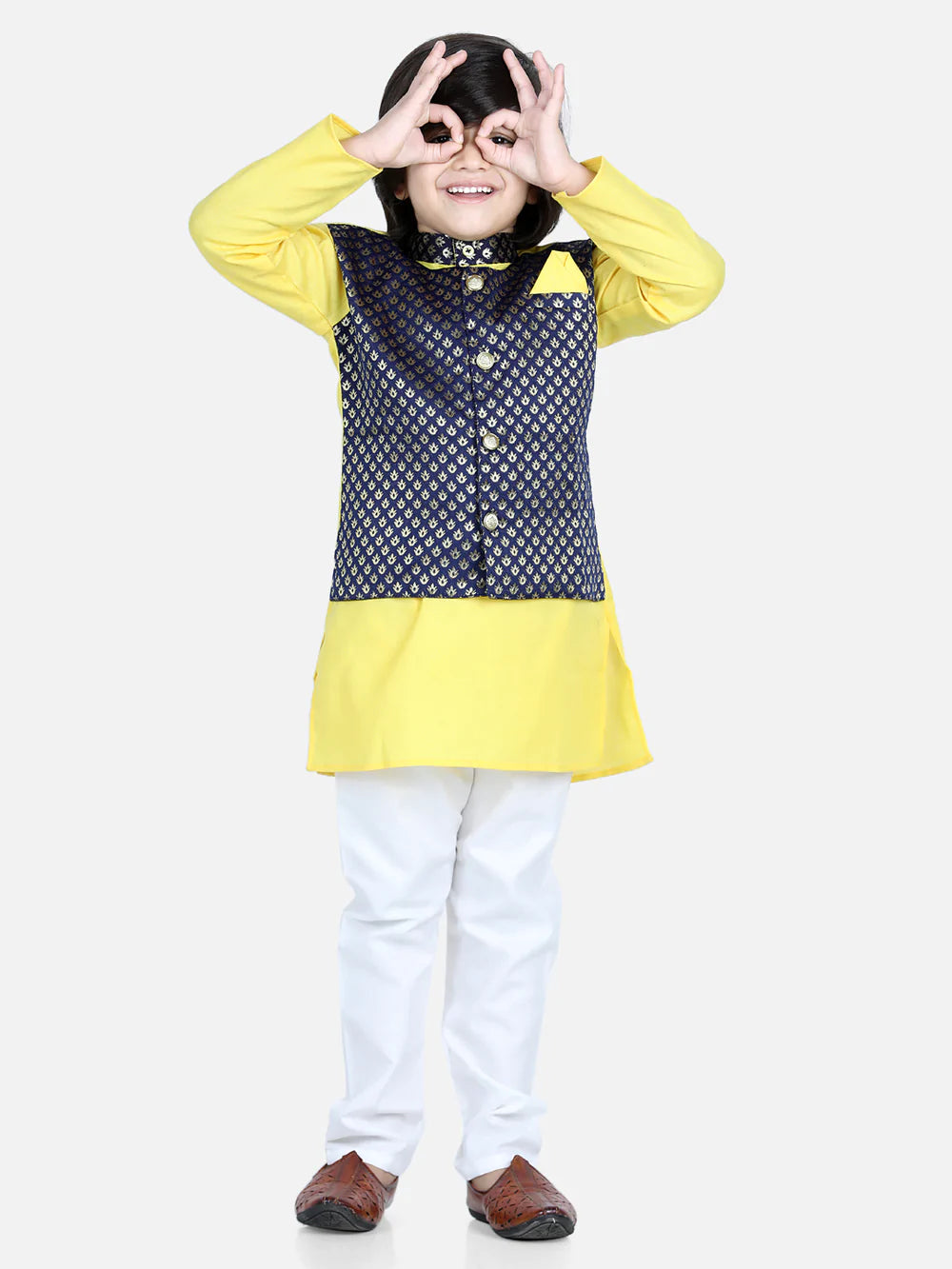 Attached Jacquard Jacket Kurta Pajama for Boys- Yellow