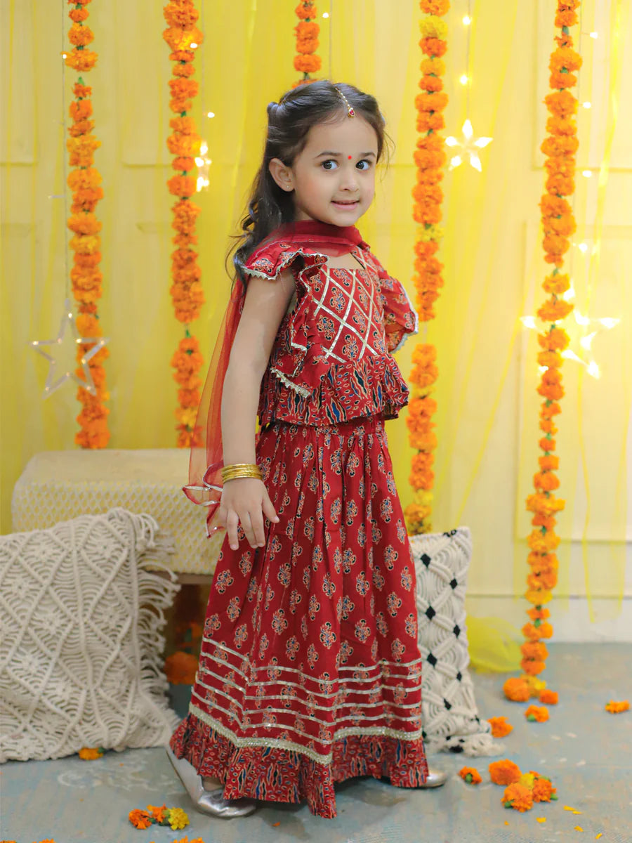BownBee Girls Pure Cotton Printed Ruffle Top Lehenga with Dupatta- Red
