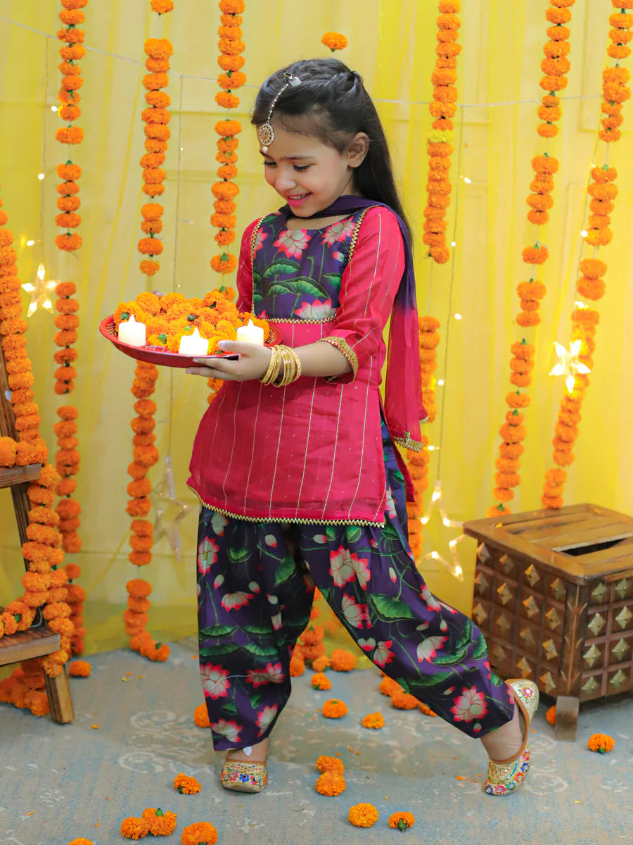 BownBee Girls Ethic Traditional Indian Festive Chanderi Kurta with Printed Salwar and Dupatta - Pink