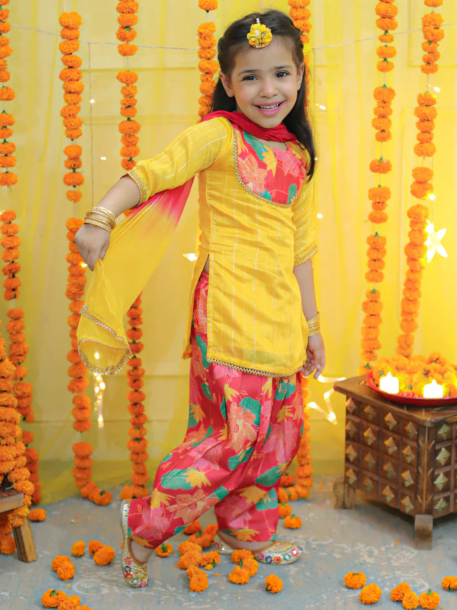 BownBee Girls Ethic Traditional Indian Festive Chanderi Kurta with Printed Salwar and Dupatta -Yellow