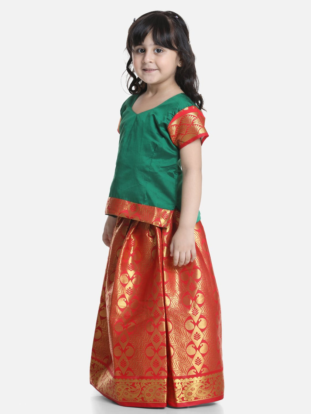 BownBee Half Sleeve South Indian Pavda Pattu Lehenga- Green
