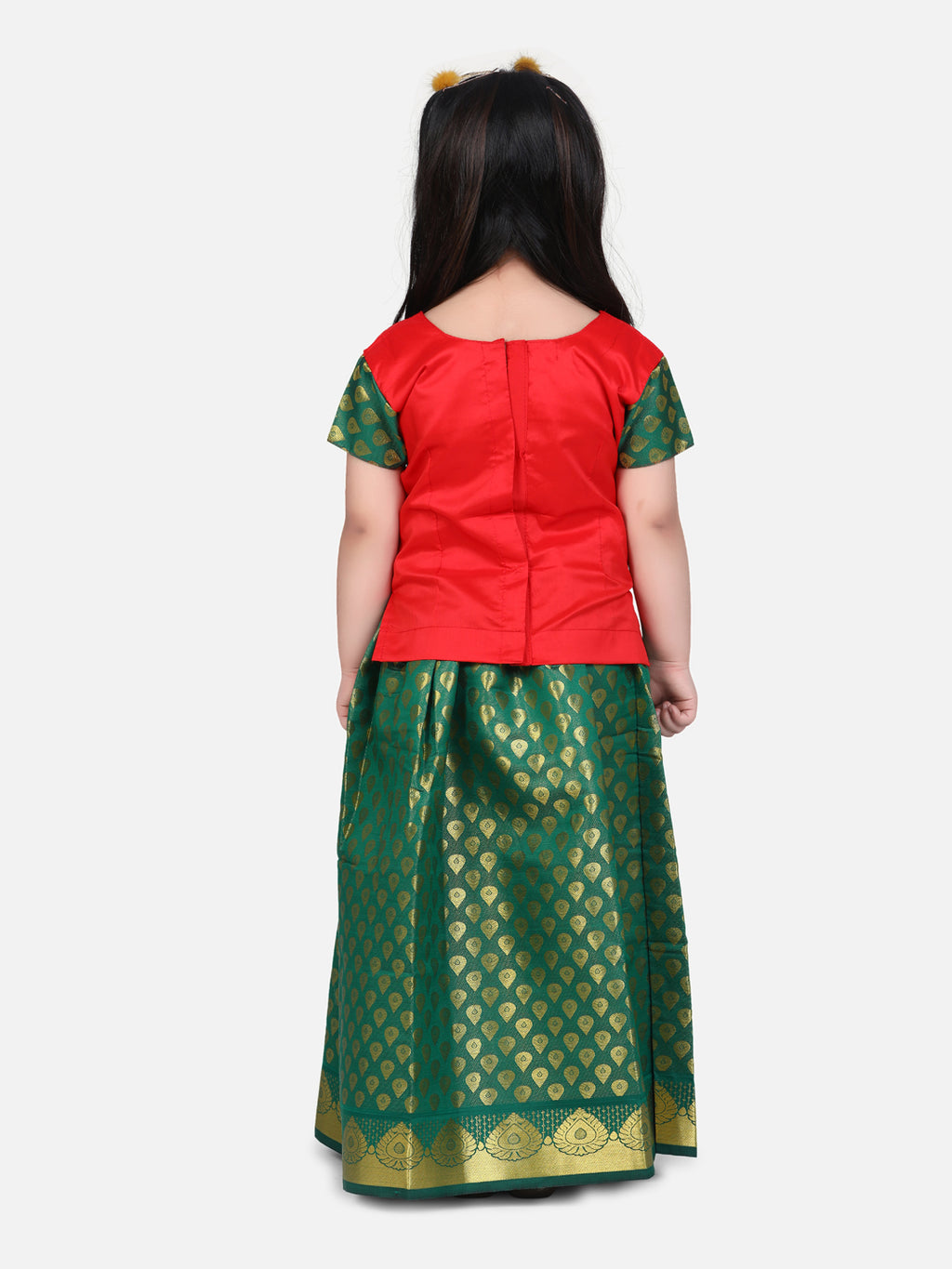 BownBee Half Sleeve South Indian Pavda Pattu Lehenga- Red
