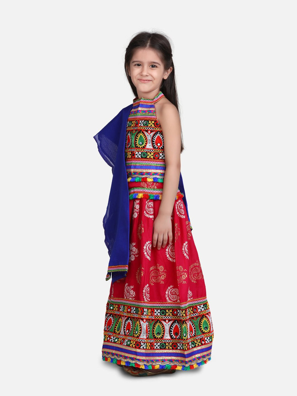 BownBee Jacquard Lehenga with Patch Choli and Dupatta Set for Girls- Red