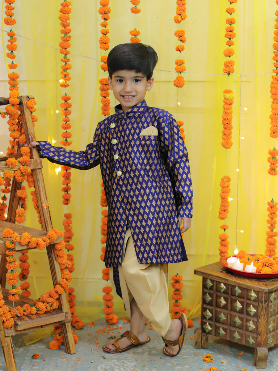 BownBee Jacquard Full Sleeve Sherwani with Dhoti for Boys- Blue