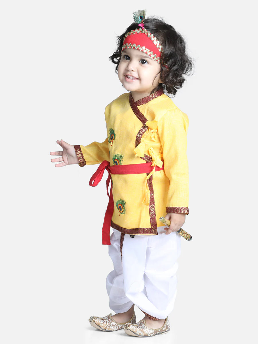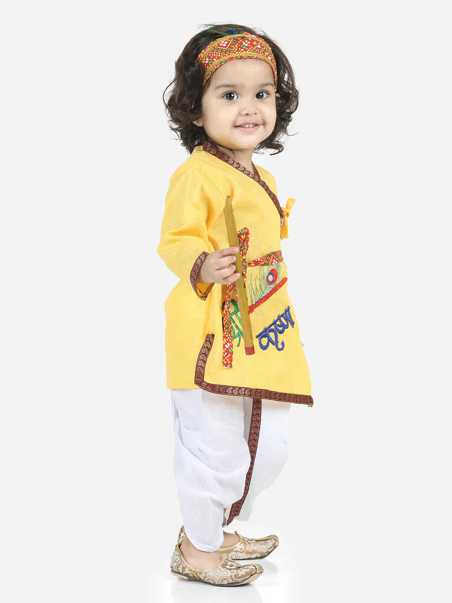 BownBee Full Sleeves Krishna Embroidery Detailing Kurta With Dhoti & Bansuri Mukut With Belt - Yellow