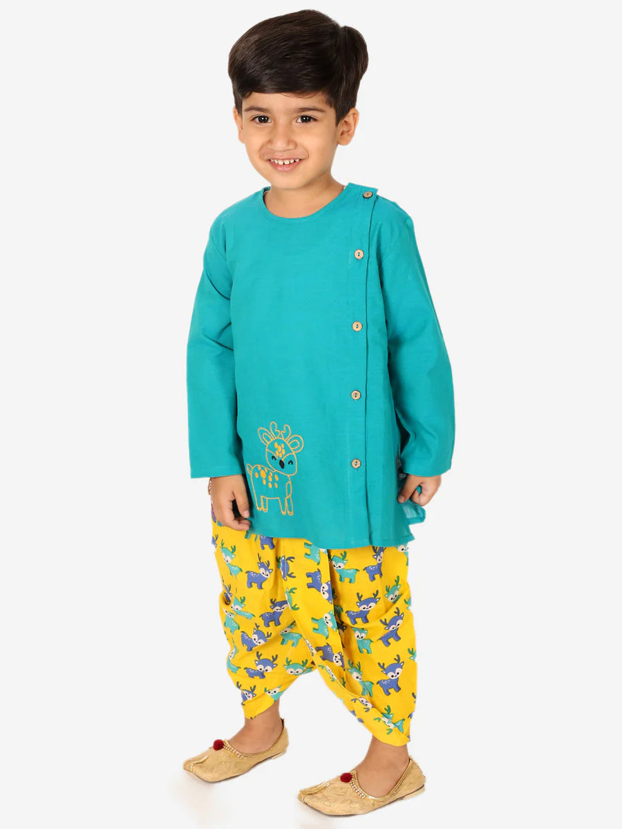 BownBee Embroidered Pure Cotton Kurta with Printed Dhoti for Boys- Green