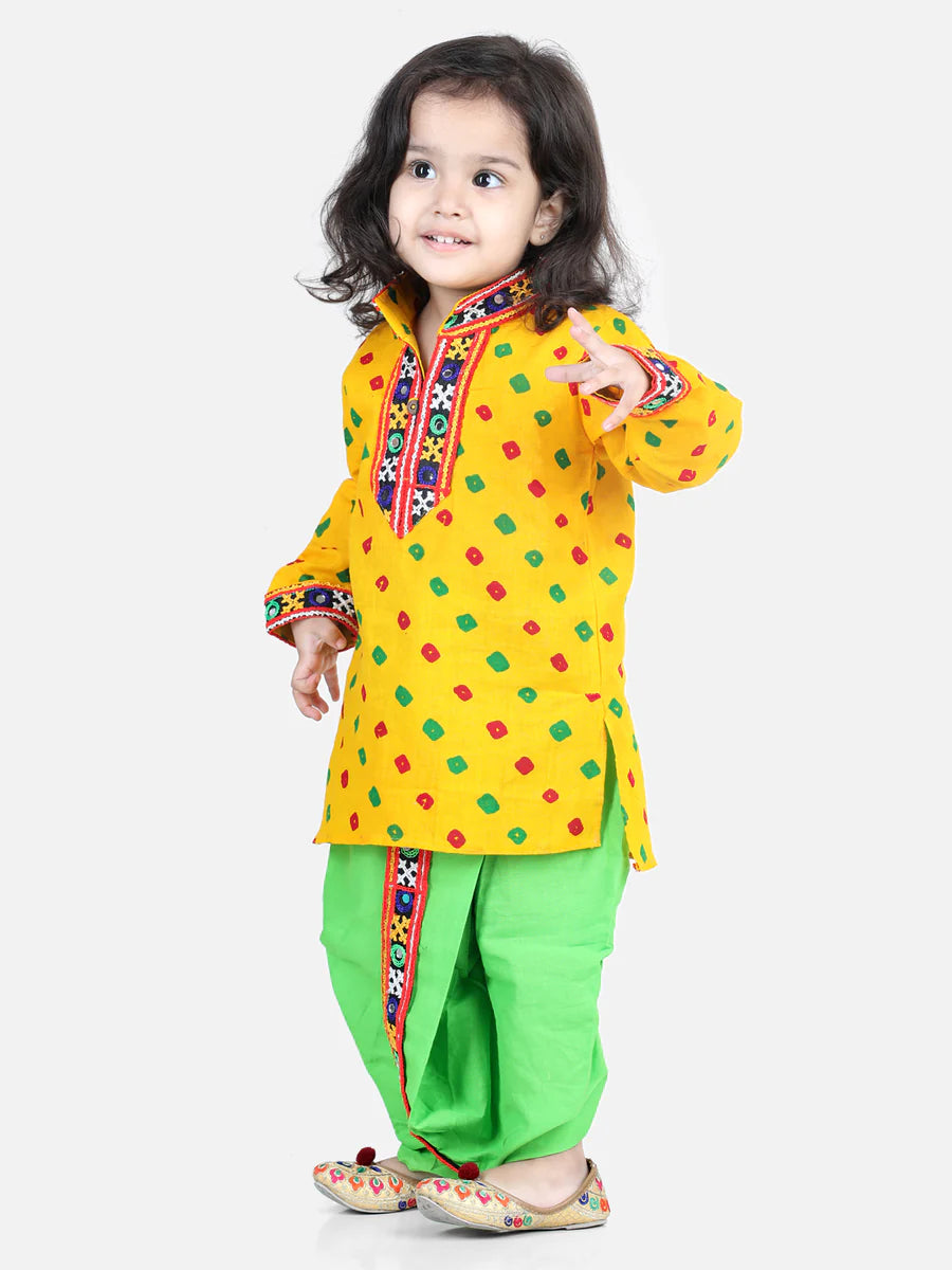 BownBee Full Sleeves Embroidered Placket & Trim Detailing Bandhani Kurta & Dhoti Set - Yellow