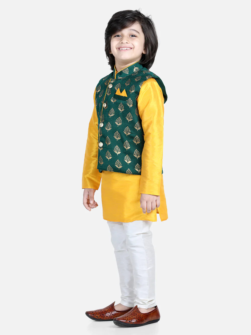 Silk Kurta Pajama With Jacquard Jacket for Boys (3 Piece Set) - Green