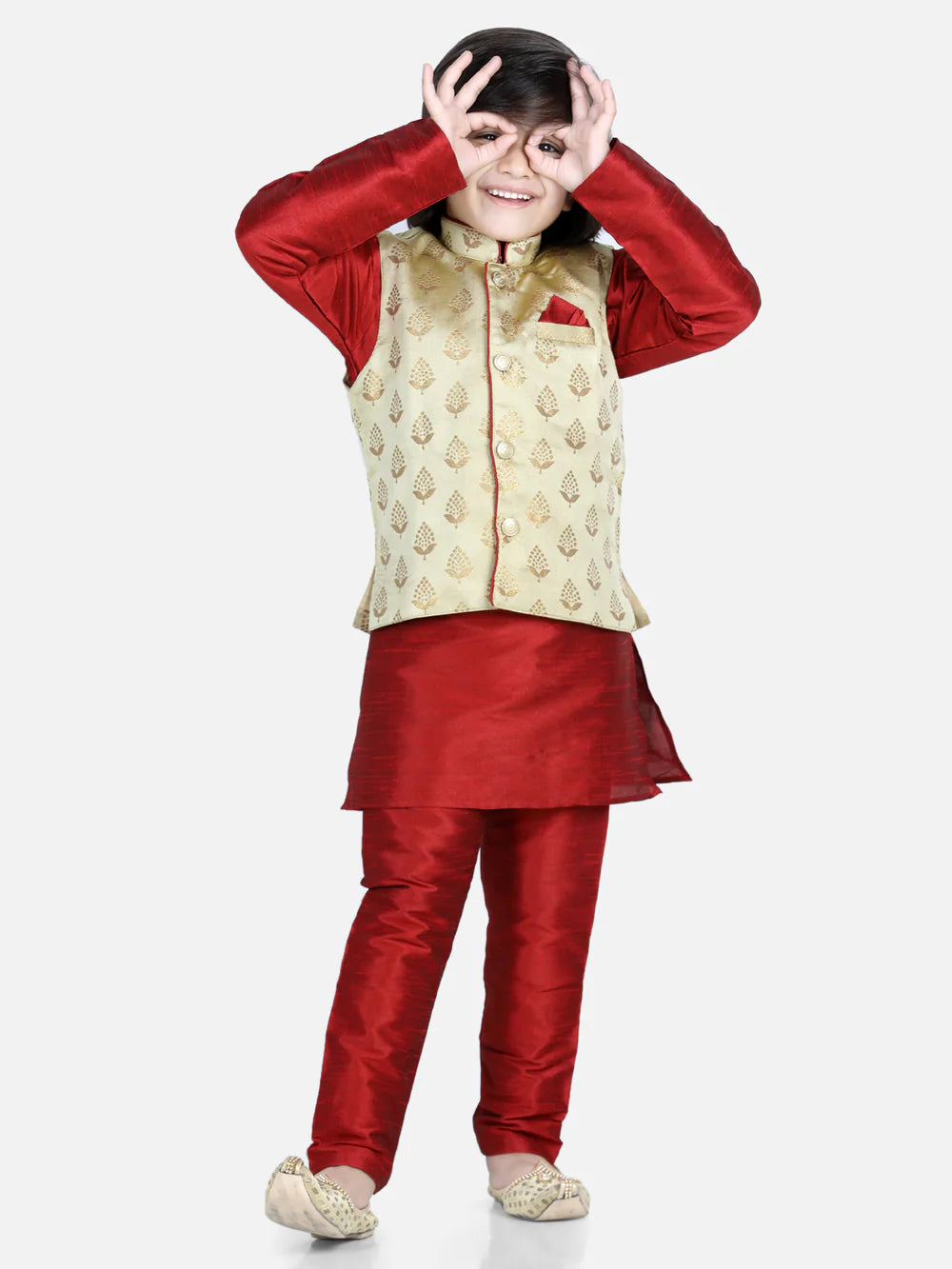 Silk Kurta Pajama With Jacquard Jacket for Boys (3 Piece Set) - Maroon