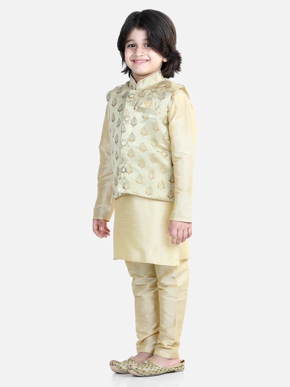 Silk Kurta Pajama With Jacquard Jacket for Boys (3 Piece Set) - Beige