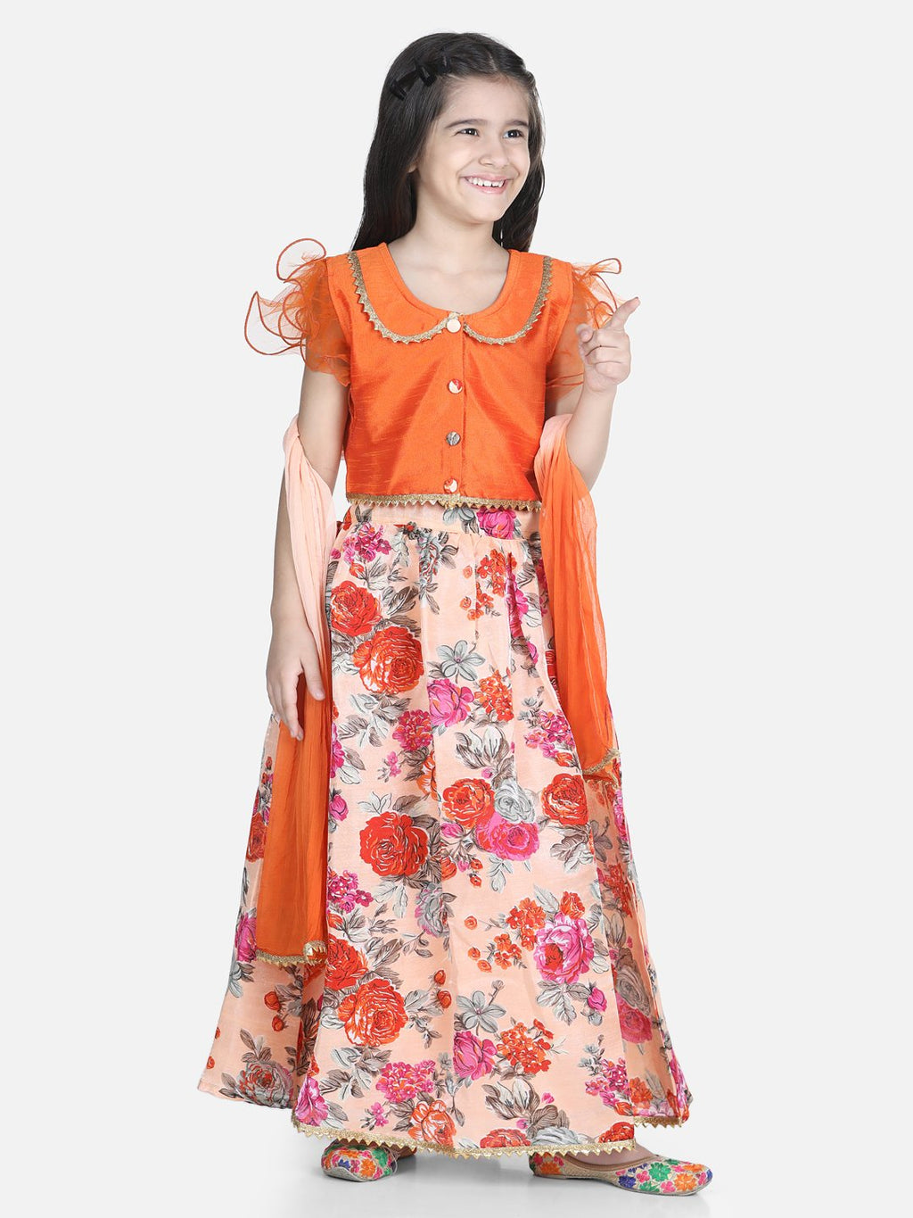 Ruffle Sleeve Collar Choli With Floral Lehenga-Orange