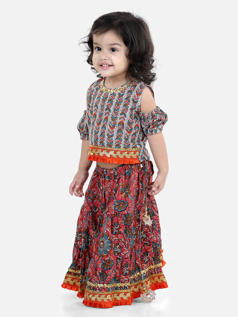 Kalamkari Print Cold Shoulder Lehenga Choli- Red