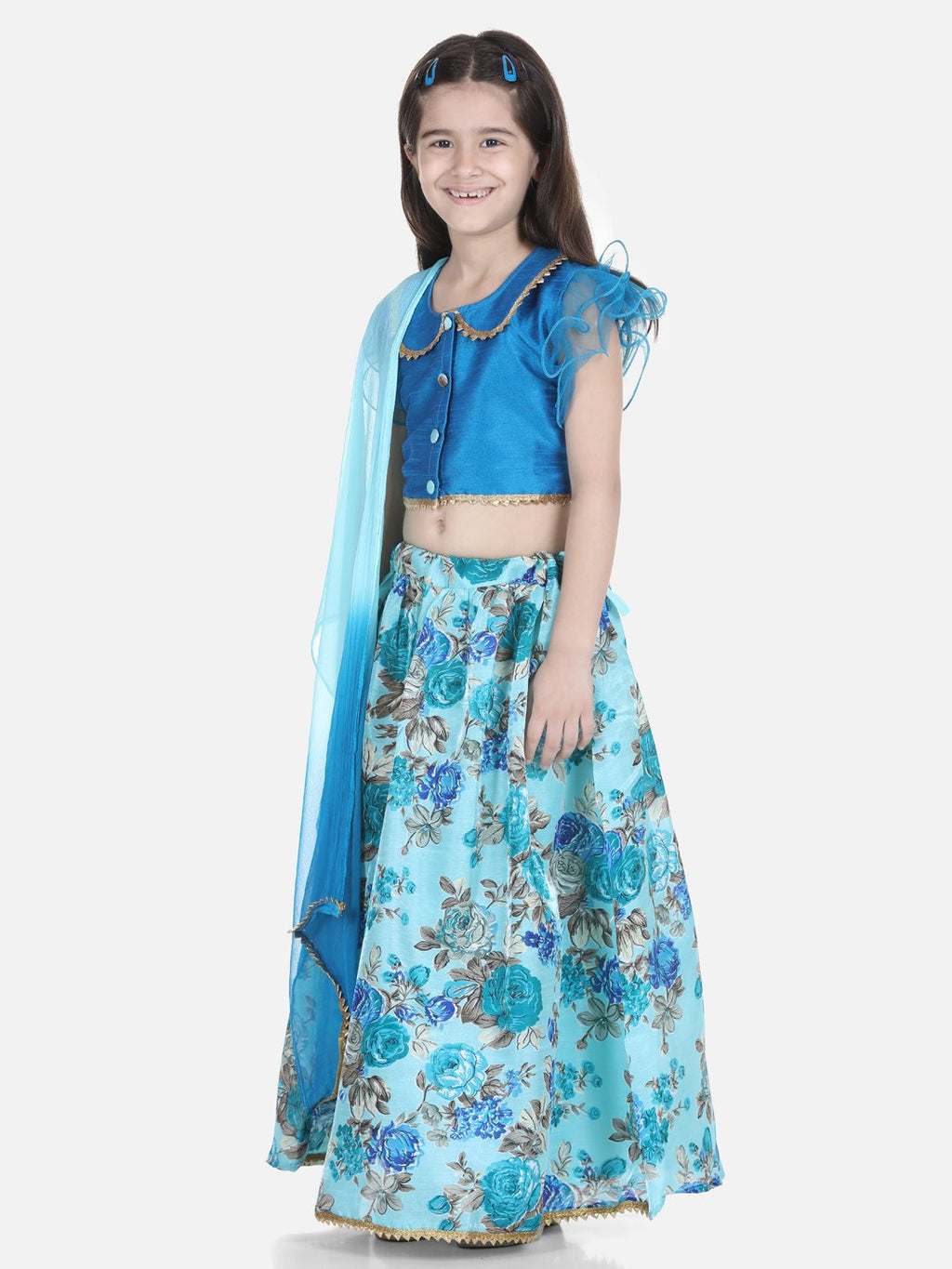 Ruffle Sleeve Collar Choli With Floral Lehenga-Blue