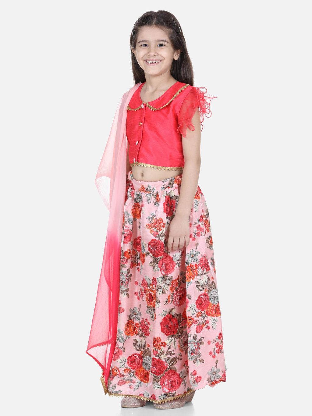 Ruffle Sleeve Collar Choli With Floral Lehenga-Pink