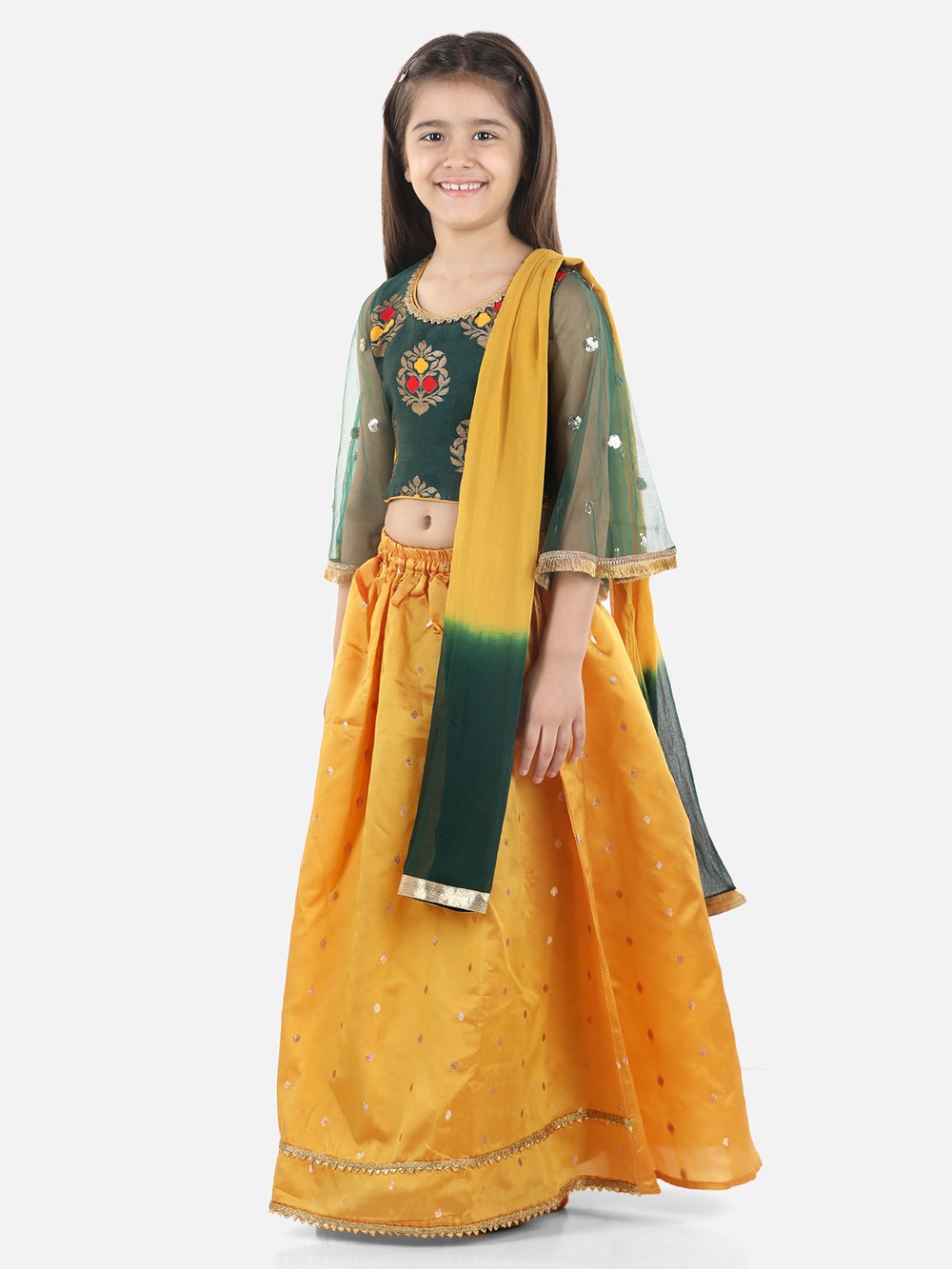 Jacquard Flared Sleeve Top with Silk Lehenga- Green
