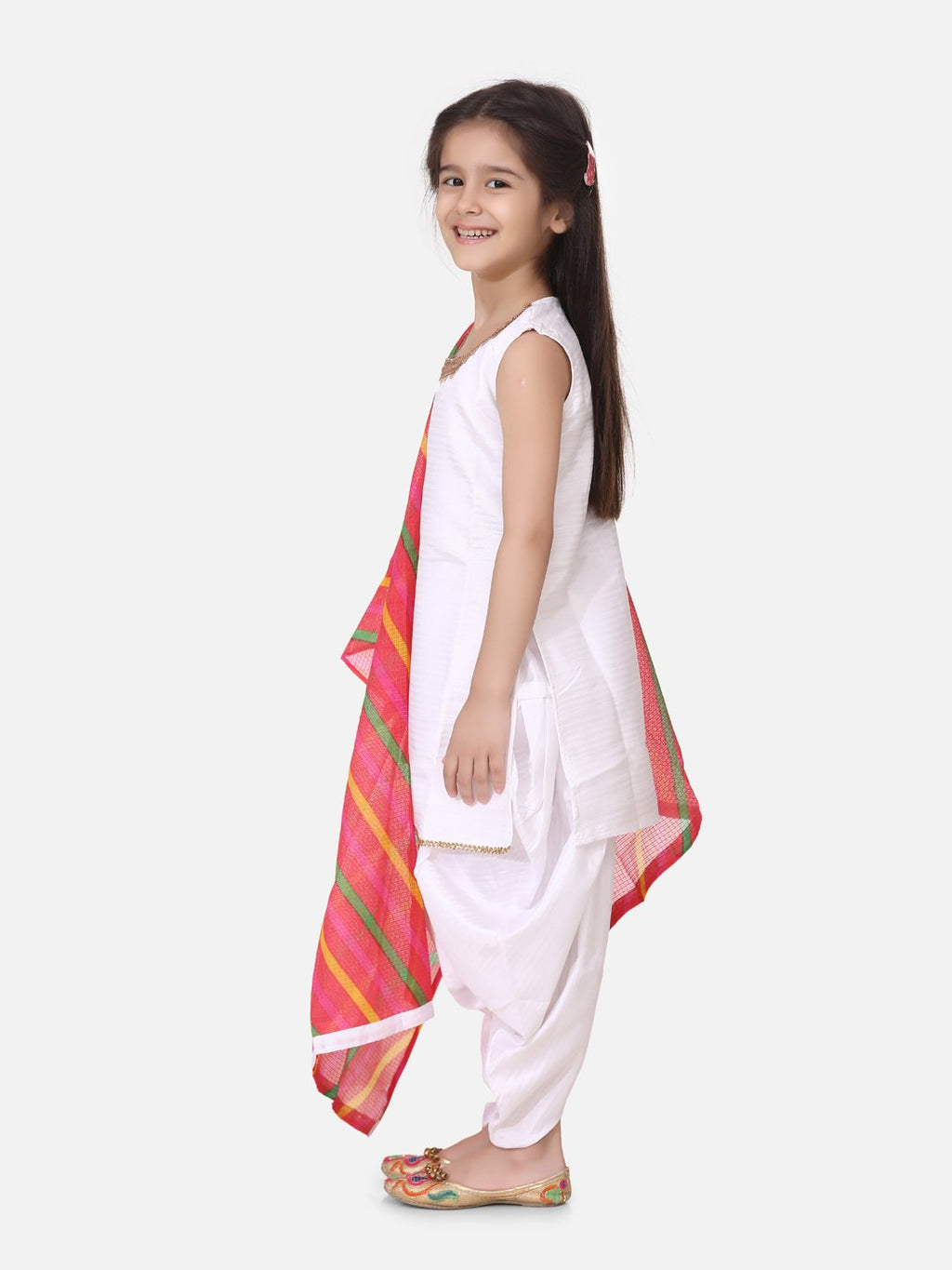 Silk Kurti Dhoti With Leheriya Dupatta For Girls-White